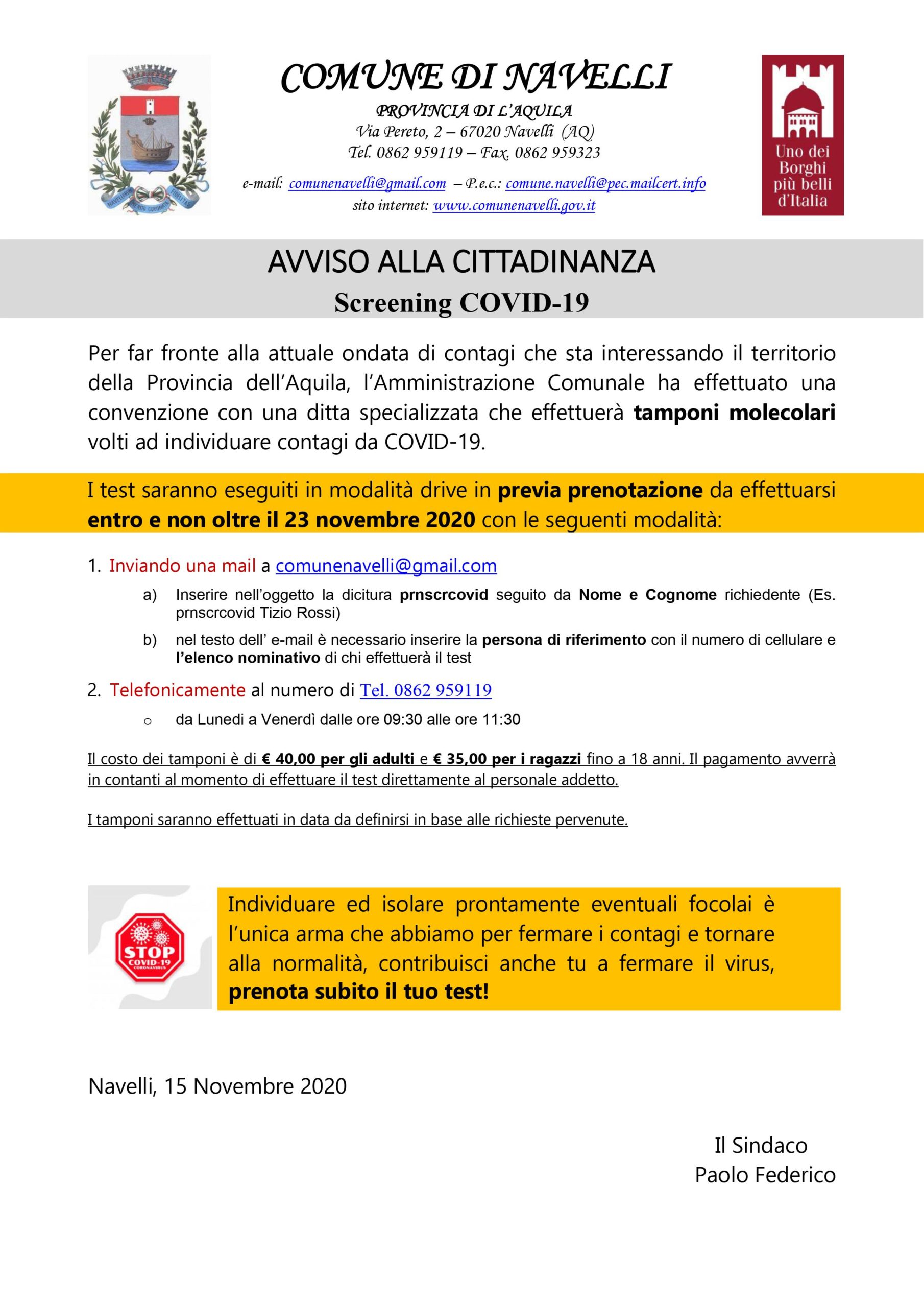 Per far fronte alla attuale ondata di contagi che sta interessando il territorio della Provincia dell’Aquila, l’Amministrazione Comunale ha effettuato una convenzione con una ditta specializzata che effettuerà tamponi molecolari volti ad individuare contagi da COVID-19.